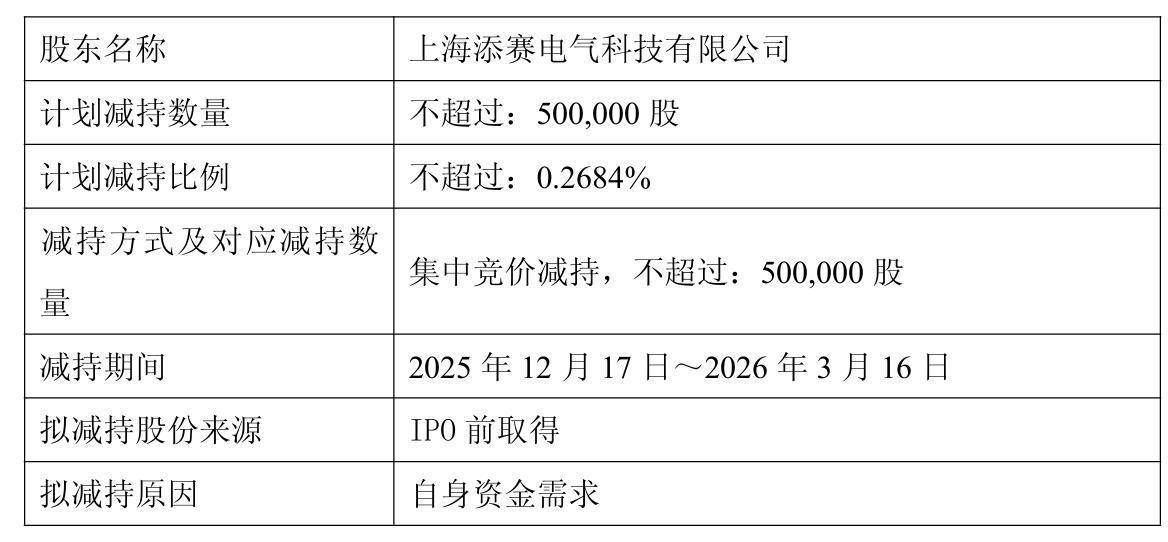 值得一提的是,洛凯股份另一股东正进行减持计划。公司持股4.3882%股东添赛电气计划在2025年12月17日至2026年3月16日减持不超过50万股,占公司总股本的0.2684%。