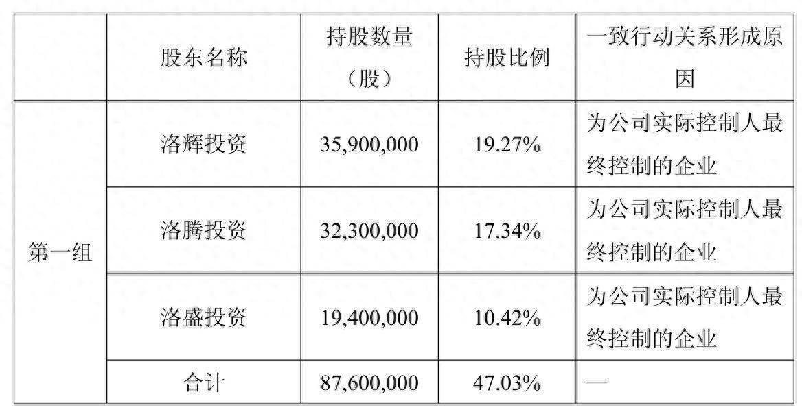 洛辉投资、洛腾投资、洛盛投资为一致行动人,合计持有公司股份8760万股,占公司总股本的47.03%,所持股份均为IPO前取得。